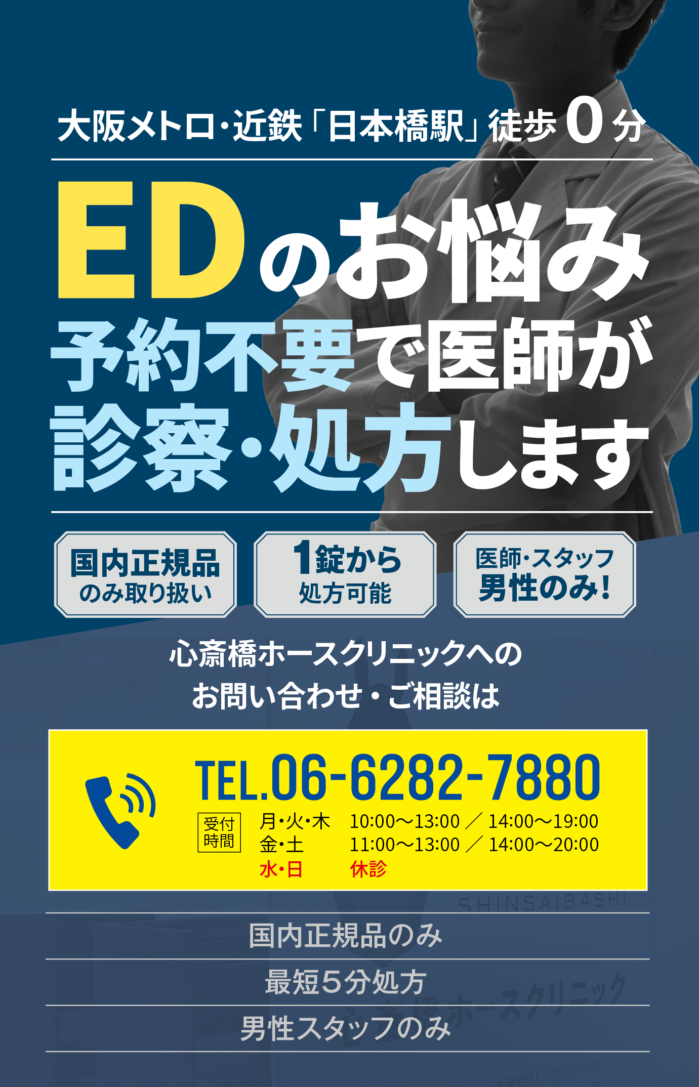 EDのデリケートなお悩みに寄り添えるように駅から近く利便性のいい立地に、男性スタッフのみで開院させていただきました。