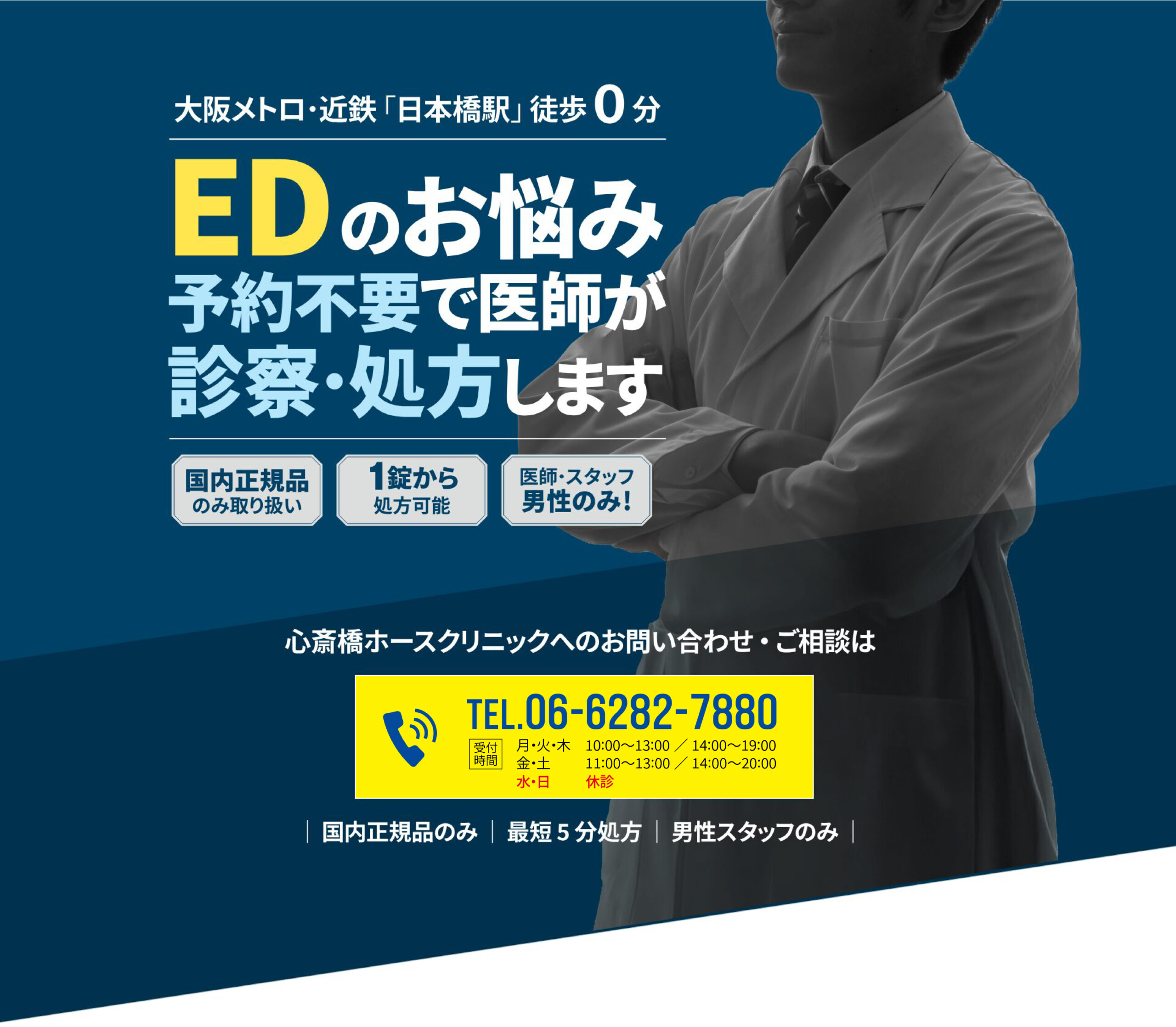 医師・スタッフはすべて男性ですのでご安心ください。